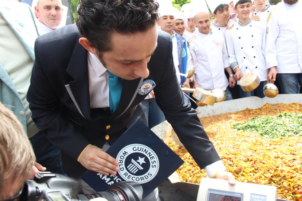 Огромное блюдо готовили на площади перед Уйгурским театром в Алматы. "Мировой рекорд сейчас составляет 687 килограммов. До этого мирового рекорда на самый большой в мире лагман не было, потому что у нас есть минимальное требование по весу в 500 килограммов. Главные критерии - лагман должен быть приготовлен по традиционному рецепту и раздаваться в одном блюде", - сказал представитель Книги рекордов Гиннесса Бенжамин Бекхаус. Он сообщил, что мировой рекорд о самом большом лагмане в мире зафиксируют на веб-сайте организации ближе к 5 мая. В книгу он может попасть в 2016 году.