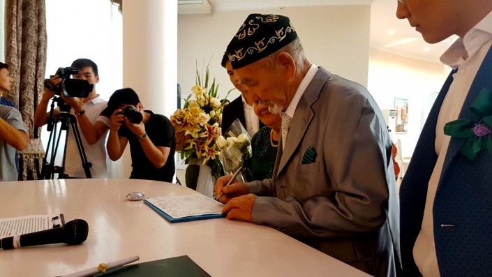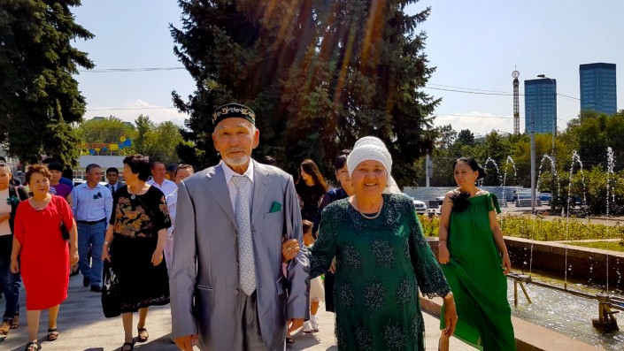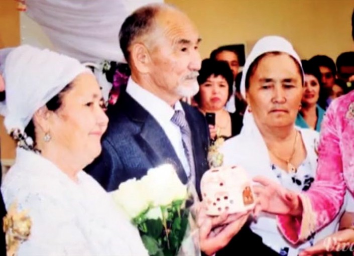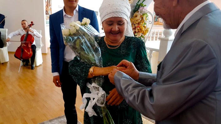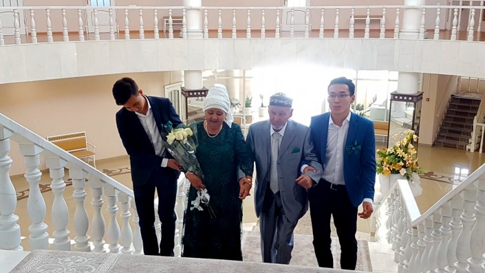 На очередную свадьбу пара оделась как подобает - невеста в специально сшитом безупречном платье изумрудного цвета в пол. Жених в сером костюме и зеленой тюбетейке. Гости также соблюли дресс-код. Нургуль Кадыргулова и Келгенбай Жасапбергенов поженились в 1962 году, с тех пор родили и воспитали восьмерых детей, более 30 внуков и правнуков. "Мне было 19 лет, а ей - 16, - продолжает жених Келгенбай-ата. Сразу мне она понравилась, это же любовь с первого взгляда. Я по 16 часов в сутки работал, чтобы обеспечить семью. Дом, конечно, был, я отстроил сам. Сейчас смотрю на молодежь, ругаются, разводятся, едва поженившись. Когда мы с Нургуль слышим, что чья-то дочь вернулась в отчий дом или чей-то сын бросил жену и детей, очень сильно переживаем. Молодые люди нетерпеливые, а для сохранения брака нужны терпеливость и выдержка".