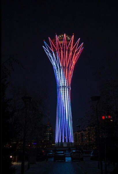 Однако позднее представители "Байтерека" сообщили о том, что монумент в цвета французского флага окрашен не был.