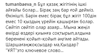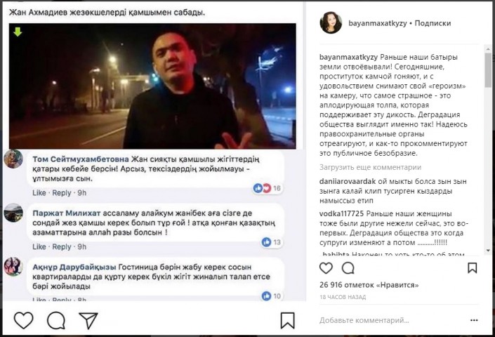 "Бұрын батырларымыз жерді жаудан қорғаған! Бүгінгілер камшымен жезөкшені қуалап жүр, осы "батырлығын" рахаттана камераға түсіреді, қорқыныштысы - оның ісіне қолдау білдіріп, қошемет көрсеткен жұрт. Қоғамның кері кеткенінің айқын мысалы! Құқық қорғау органдары бұған бағасын беріп, қоғамдық шектен шыққан жағдайға қатысты пікір білдіреді деп үміттенемін", - дейді Алагөзова.