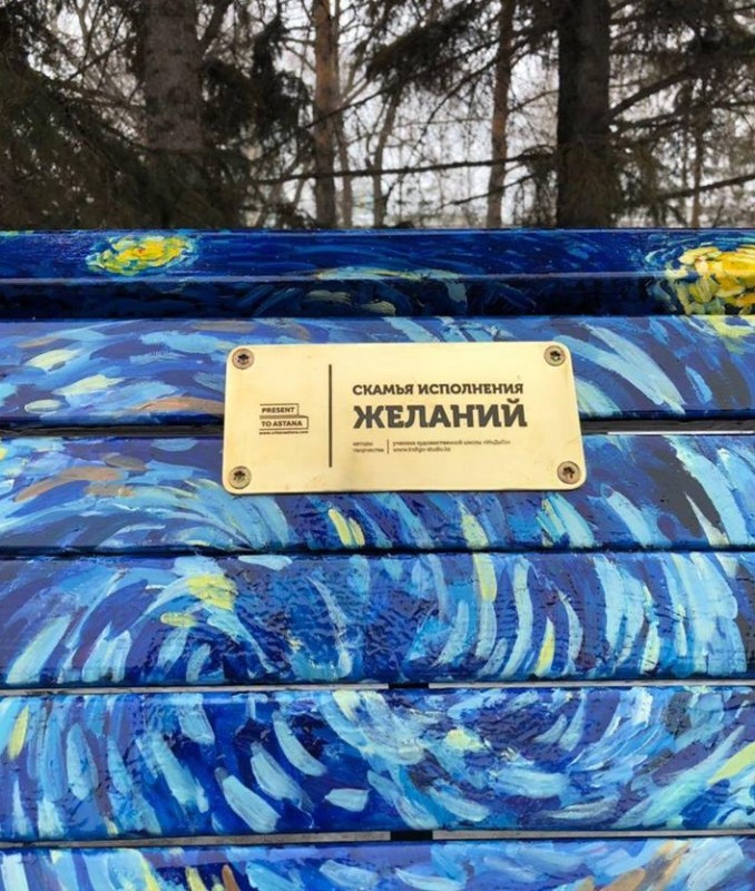"Волшебная" скамейка находится в сквере "Керей және Жәнібек хандар". Такую красивую именную скамейку установили ученики художественной школы "Индиго" в рамках благотворительного марафона "Впиши свое имя в историю столицы", который стал уже очень популярным среди жителей Астаны", - добавил Арман Турлубек.