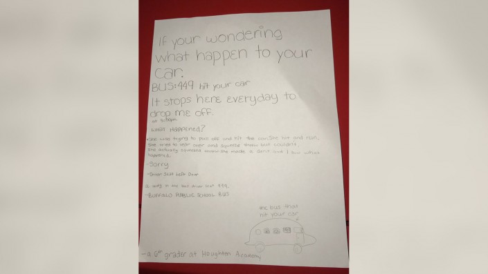 Эндрю рассказал, что записку написала шестиклассница, которая, к сожалению, не указала имя. Но благодаря ей он нашел виновника, который повредил его красный "Форд Мустанг". И сохранил деньги - чинить автомобиль самому ему не придется. "Спасибо анонимной шестикласснице, которая помогла спасти мне пару тысяч (автобус нарисован не в масштабе)", - написал он.