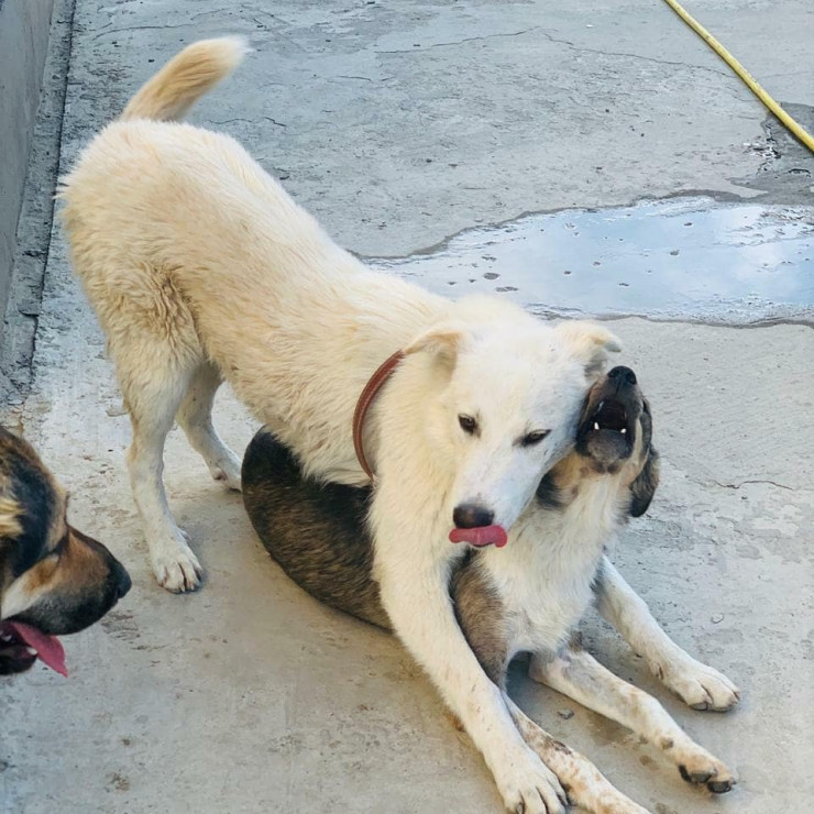 Сейчас, по словам волонтеров, пес чувствует себя лучше, он активно двигается и играет с другими собаками.