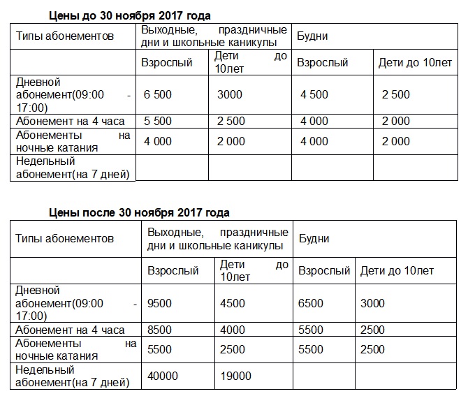 До 10 ноября действует специальное предложение: 25-процентная скидка на все сезонники. До 10 ноября купить сезонный абонемент возможно по цене 115 000 тенге (детский), 160 000 тенге (молодежный) и 220 000 тенге (взрослый). Добавим, что цены на абонементы без скидки составят 290 000 тенге (взрослый), 210 000 тенге (молодежный) и 150 000 тенге (детский).