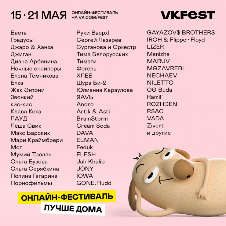 Последние новинки и уже популярные треки на онлайн-фестивале исполнят: Баста, Градусы, Джаро & Ханза, Джиган, Диана Арбенина. Ночные снайперы, Елена Темникова, елка, Жак Энтони, Звонкий, кис-кис, Клава Кока, ЛАУД, Леша Свик, Макс Барских, Мари Краймбрери, Мот, Мумий Тролль, Ольга Бузова, Ольга Серябкина, Полина Гагарина, Порнофильмы, Руки Вверх!, Сергей Лазарев, Сурганова и оркестр, Тима Белорусских, Тимати, Фогель, ХЛЕБ, Шура Би-2, Юлианна Караулова, ЯАVЬ, Andro, Artik & Asti, BrainStorm, Cream Soda, DAVA, ELMAN, Feduk, FLESH, GAYAZOV$ BROTHER$, GONE.Fludd, IOWA, IROH & Flipper Floyd, Jah Khalib, Jony, Lizer, Manizha, Maruv, MGZAVREBI, NECHAEV, NILETTO, OG Buda, Ramil’, ROZHDEN, RSAC, VADA, Zivert.