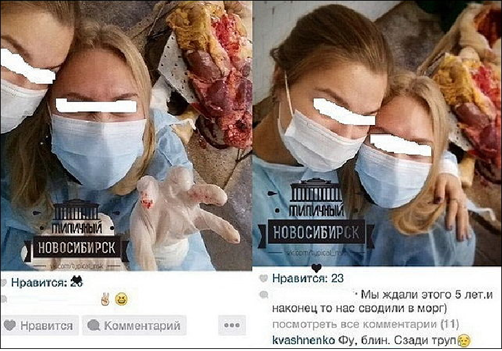 Две студентки из Новосибирска навлекли на себя гнев общественности после того, как на днях разместили в социальных сетях фотографии из морга, на которых девушки позируют на фоне человеческих органов и расчлененных трупов. В частности, снимки были опубликованы в паблике "Типичный Новосибирск" в "ВКонтакте", набрав кучу комментариев.