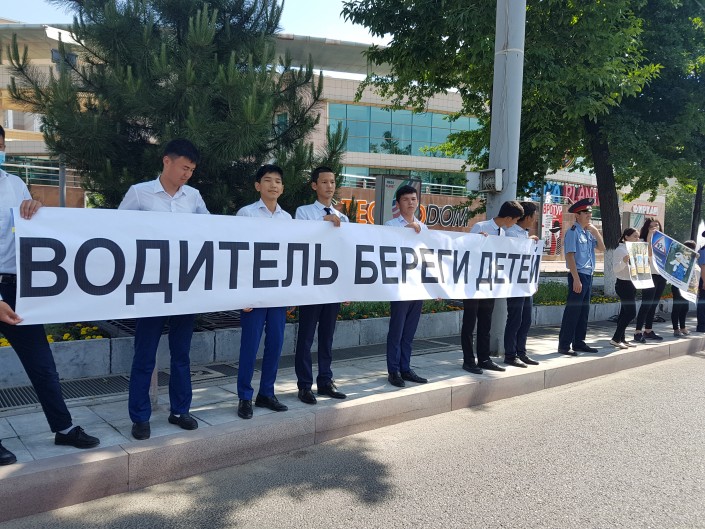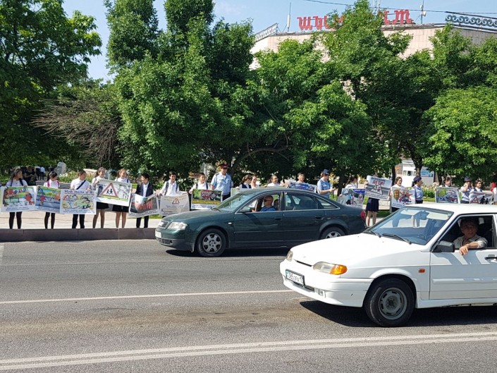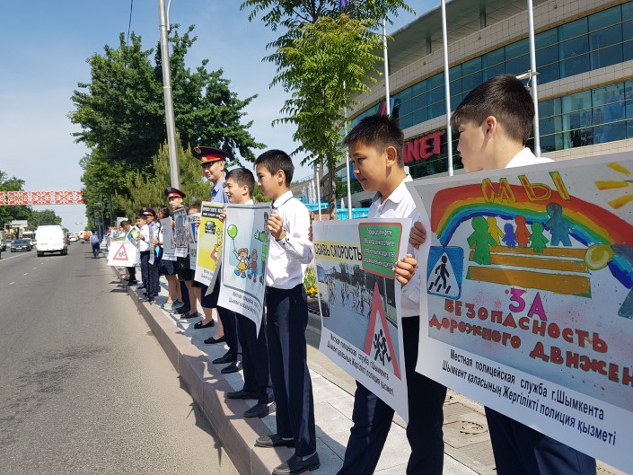Масштабную акцию провели школьники и местные полицейские Шымкента. Колонны школьников под руководством сотрудников в форме занимают место вдоль проспекта Тауке-Хана. Водители сначала недоумевали, а затем с любопытством разглядывали плакаты в руках детей. 165 ребят вышли на самый загруженный перекресток в городе, чтобы обратиться к водителям, которые любят ездить на большой скорости и не замечают знаки дорожного движения. "Мы стоим как раз на светофоре, и когда водители подъезжают, то они не смотрят в сторону, а смотрят на наши плакаты. Надеемся, что водители нас увидели и услышали", - рассказывает ученица Алтынай Каримова.