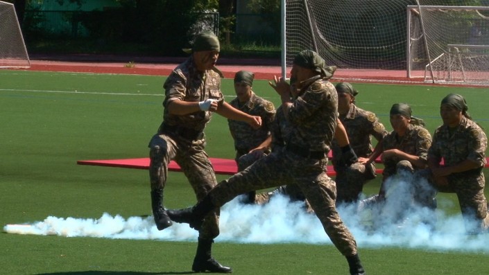 Тафгай "Барыса" Дамир Рыспаев, как и остальные новобранцы, прошел курс молодого бойца. "Я стал военнообязанным человеком, достойным гражданином Республики Казахстан. Я буду служить полноценный год. До воинской присяги я был здесь 35 дней. Для меня это все ново. Самое интересное и сложное было на полигоне: надели ОЗК, была невыносимая жара 32 градуса, и мы побежали марш-бросок!".