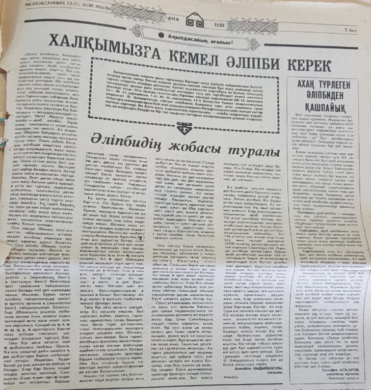 Бұл - "Ана тілінің" 1991 жылғы 12 желтоқсандағы нөмірі. Жазушы Балғабек Қыдырбекұлы бұл мақалада халқымыздың тарихындағы бірнеше жазу жүйесіне тоқталып өткен екен.