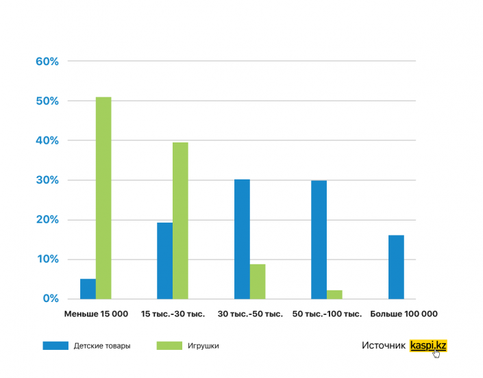 Например, в магазине на сайте Kaspi.kz категория "Детские товары" появилась всего несколько месяцев назад. Сейчас из всех клиентов, которые покупают коляски, кроватки и другие детские товары с помощью рассрочки или кредита Kaspi, уже около трети перешли в онлайн.