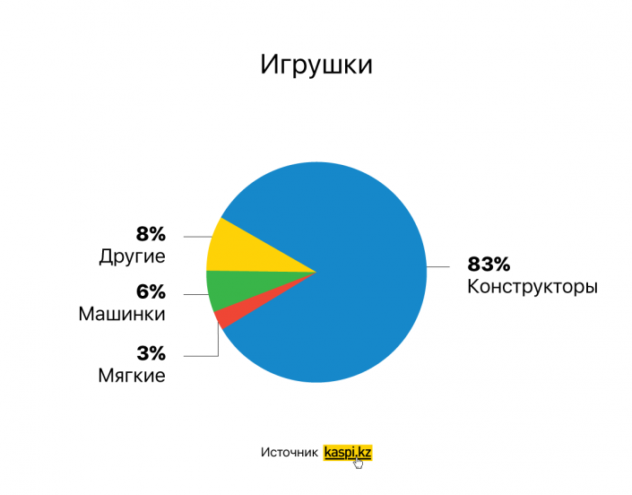 Среди игрушек 83 процента продаж приходится на конструкторы. Цены на них начинаются от двух тысяч тенге и достигают 165 тысяч.