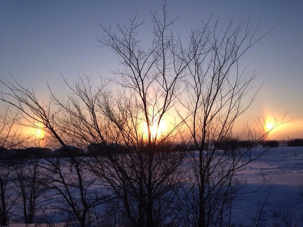 Сразу три солнца в небе - это редкое оптическое явление под названием "эффект Гало", которое можно наблюдать в морозную и ясную погоду. В это время в воздухе образуются небольшие ледяные шестигранные кристаллы, которые нельзя увидеть невооруженным взглядом. Сквозь них преломляются лучи солнца. В результате создаются оптические иллюзии.