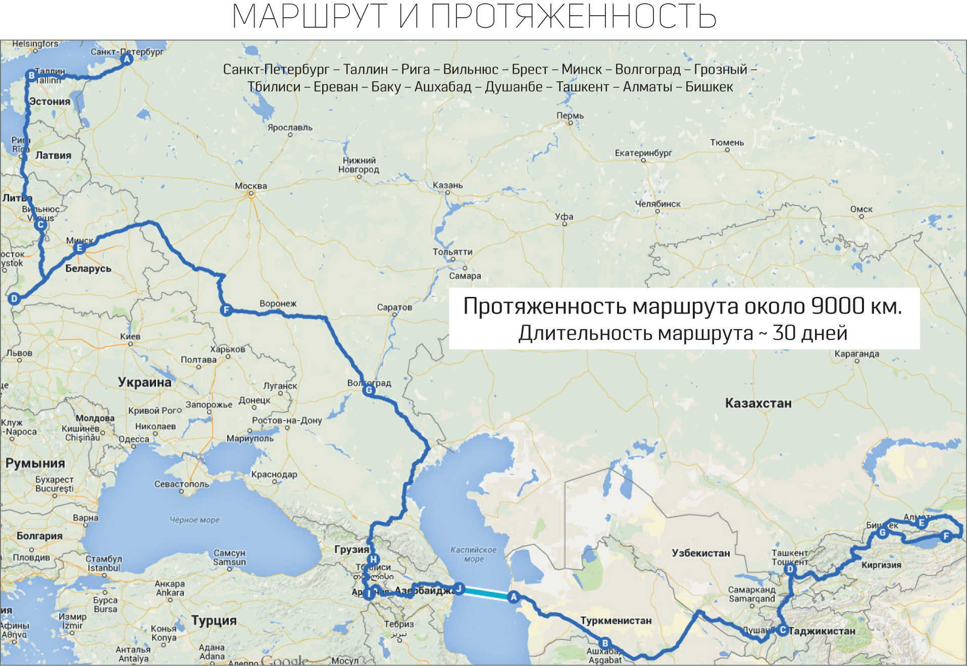 Мотопробег, организованный при поддержке Русского Географического общества и Казахстанского Национального Географического общества, стартовал 8 мая, накануне Дня Победы, от Пискаревского мемориала в Санкт-Петербурге. Маршрут, протяженностью более 9 тысяч километров, пролегал по территориям основных городов, столиц и административных центров пятнадцати бывших республик Советского Союза: Санкт-Петербург - Таллин - Рига - Вильнюс - Брест - Минск - Волгоград - Грозный - Тбилиси - Ереван - Баку - Ашхабад - Душанбе - Ташкент - Алматы - Бишкек.