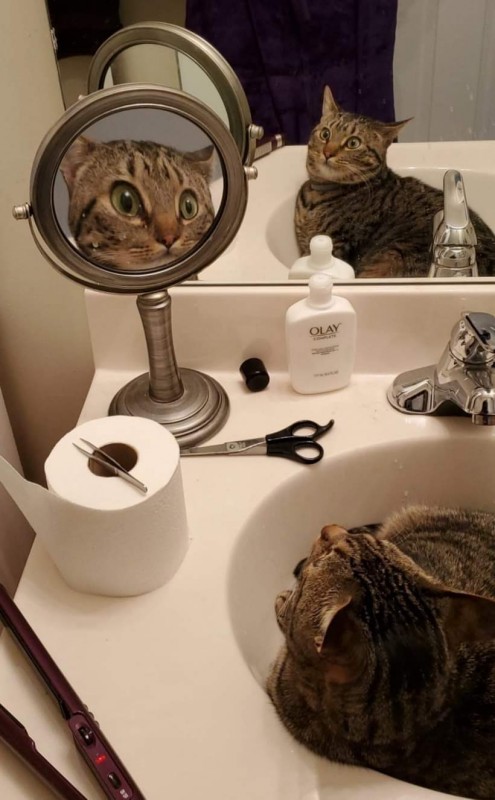 На снимке удивленный кот сидит в раковине напротив двух зеркал. Из-за косметического зеркала, которое увеличивает изображение, голова кота кажется крупнее, чем на самом деле.