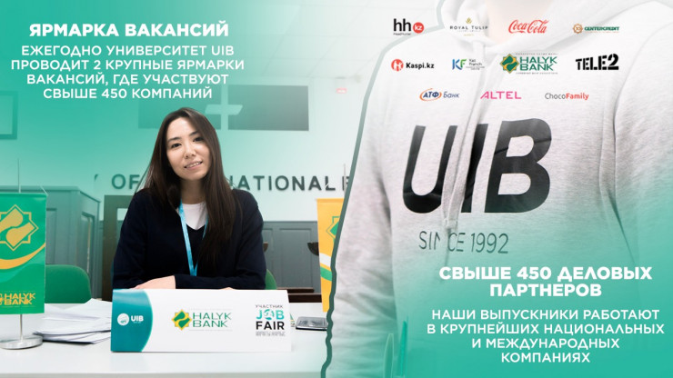 Центром карьеры UIB на постоянной основе осуществляются консультации по выбору карьерной траектории обучающимися через вакансии от партнеров UIB, организацию различных практик и целевых встреч с работодателями. Работодатели, участвуя в дизайне образовательных программ (ОП), в преподавании профильных дисциплин и оценке практических знаний студентов, получают полную картину о степени подготовленности выпускников, что, несомненно, повышает их конкурентоспособность на рынке труда.