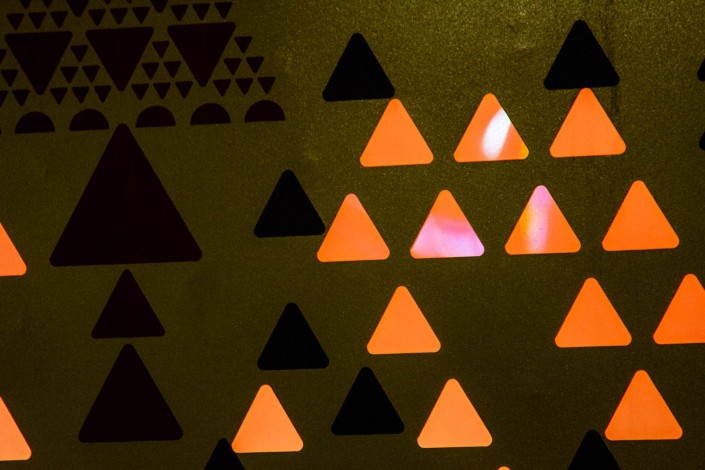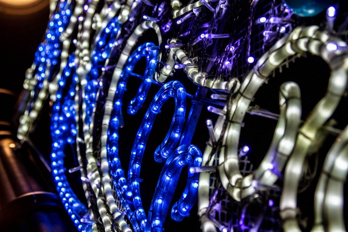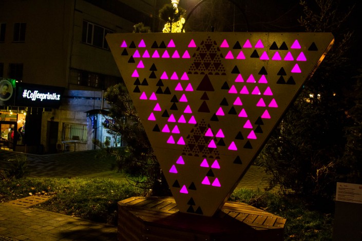 На конструкции под названием "Светило авангарда" молодого художника горят огоньки, которые переливаются несколькими цветами.