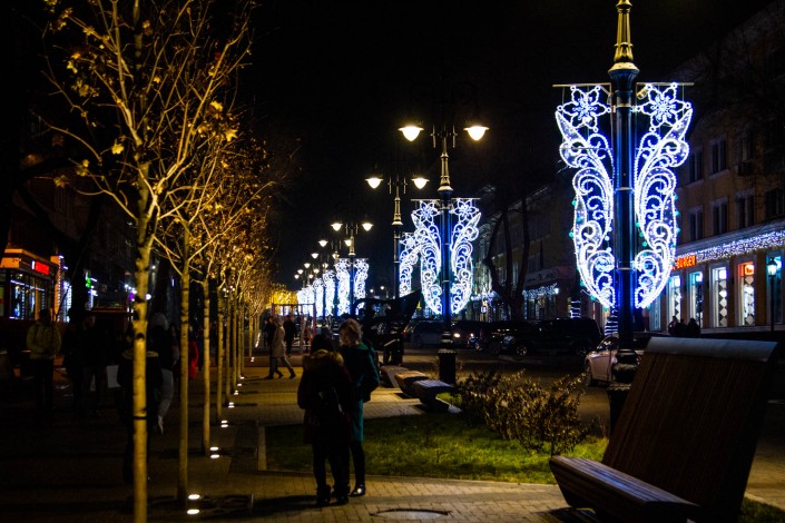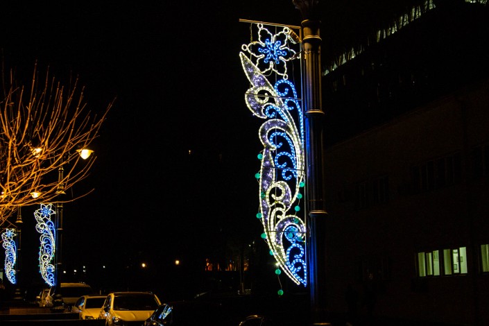 На улице Панфилова фонари украшены подсветками в этно-национальном стиле. Огни светятся синим, фиолетовым и серым цветами.