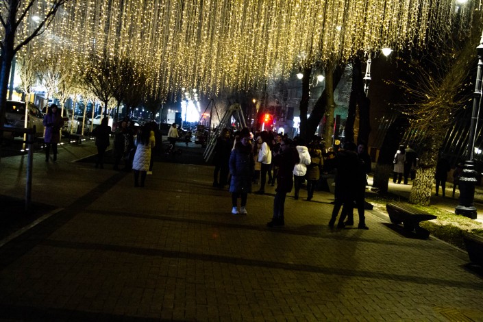 Большое скопление людей наблюдается на Панфилова - Гоголя. Горожане фотографируются на фоне установленной конструкции в виде свисающих "дождей". Тысячи сияющих огоньков горят для пешеходов.