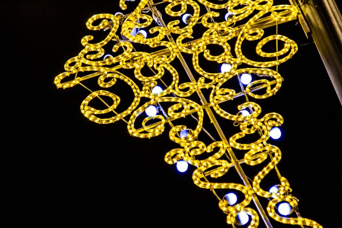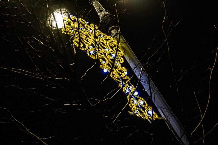 Спускаясь ниже по Панфилова, можно заметить установленные на фонарных столбах украшения, выполненные в виде национального орнамента. Украшение в желтом цвете с лампочками.
