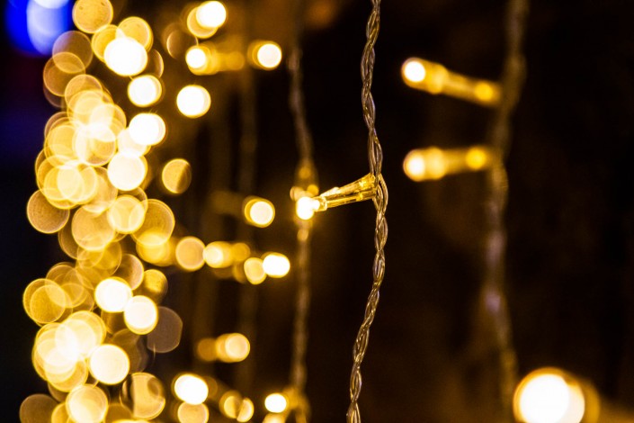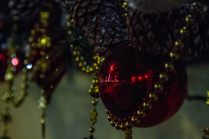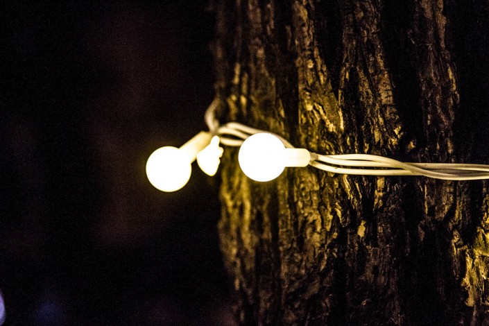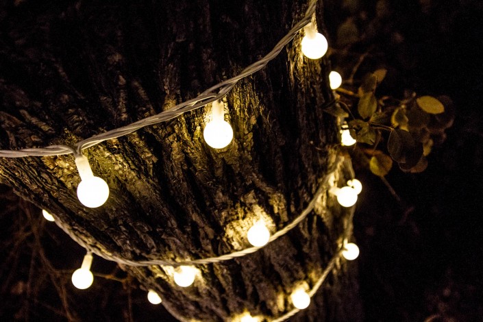 Деревья украшены елочными игрушками, гирляндами. Все они подсвечены яркими огнями.