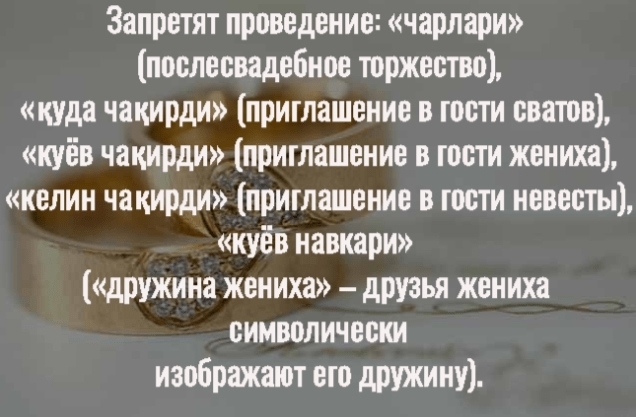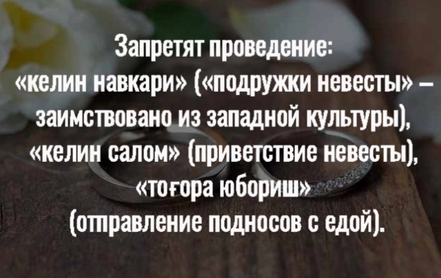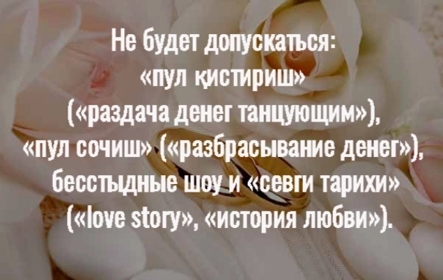 Тогда же глава государства сообщил, что власти примут постановление, регламентирующее проведение свадеб. "В Ташкенте родители четырех дочерей, чтобы сыграть свадьбы, должны повеситься! Простой человек, который получает зарплату из бюджета, может вешаться. Почему? Потому что другого выхода нет! Все равно, бедный, влезет в долги, не будет обращать внимания на свое здоровье, не пойдет к врачам, а будет копить на свадьбу. Потому что свадьба. Сколько килограммов плова, сколько мебели! Все! Мы попробовали пропагандировать, не получилась пропаганда. Кому нужна эта свадьба?" - сказал президент страны.