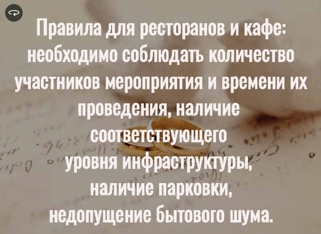 "Соответствующие рекомендации даны и в отношении самих банкетных залов. Существующим "свадебным" ресторанам необходимо пересмотреть свою инфраструктуру и планировку, а при постройке новых залов придется учитывать данные требования. То есть теперь запрещено строить банкетные залы на более чем 150 посадочных мест", - говорится в статье.