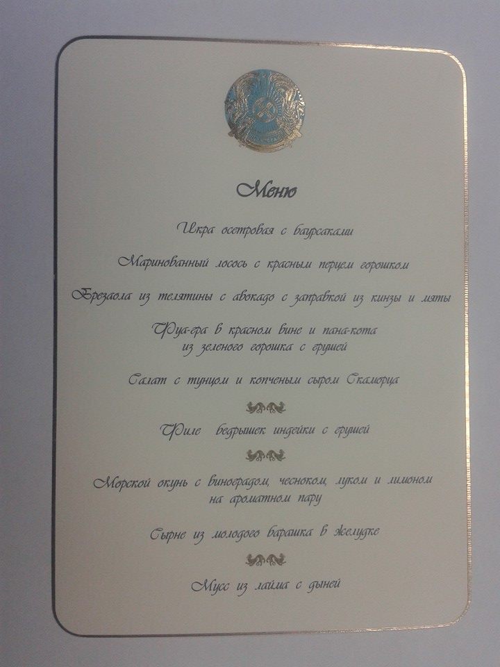 Недавно блогер Сырым Абдрахманов опубликовал на своей странице в Facebook одно из протокольных меню Главы государства. "Меню ужина Елбасы с его коллегами - мировыми главами государств. Даже не думайте копаться в Сети, это бесполезно - оно эксклюзивное", - написал он в пояснении к фото. Блогер отмечает, что каждое меню составляется с особой диетой глав государств и согласовывается с их протоколом.