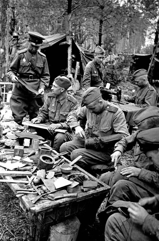 Советские бойцы за работой в походной починочной мастерской. 1943 год.