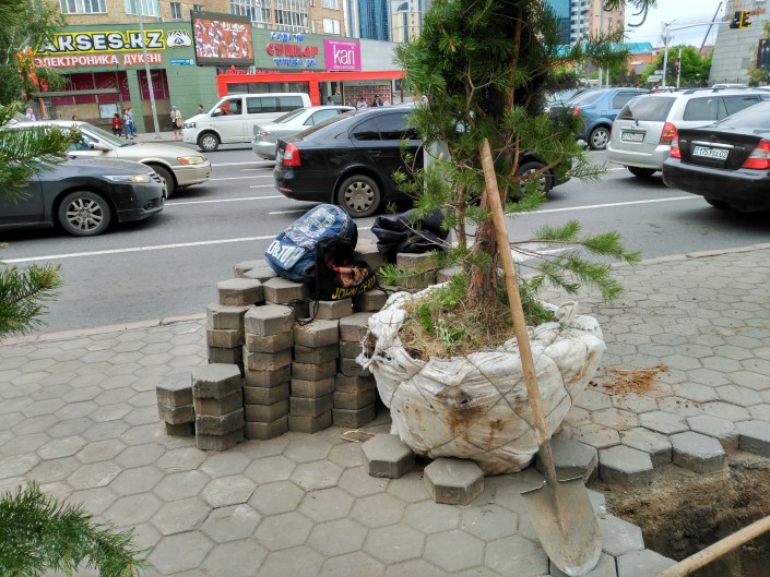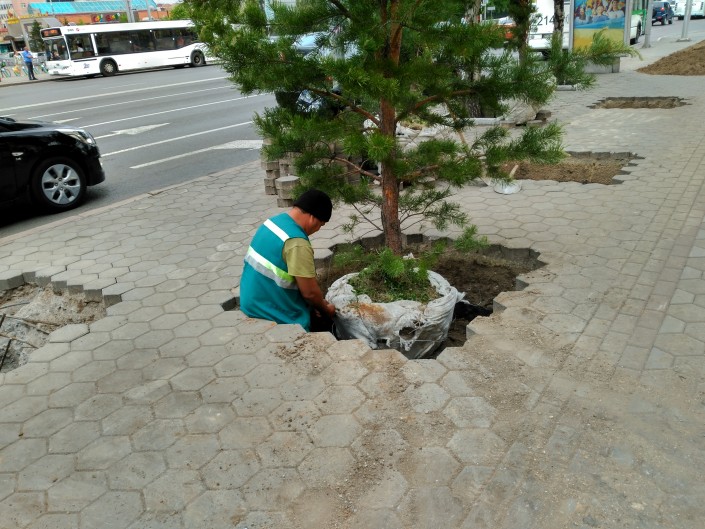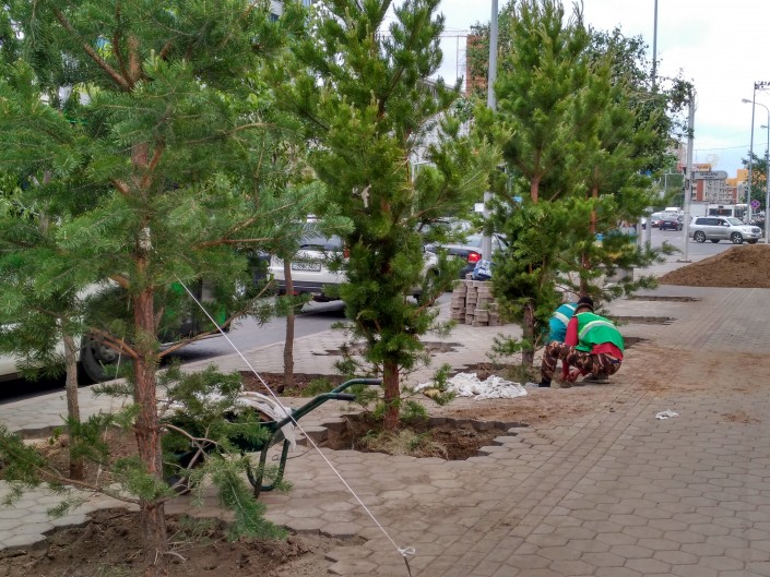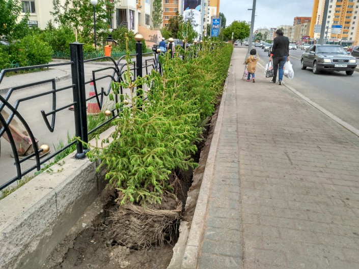 Вдоль проспекта Республики становится по-особенному зелено. Рабочие заняты высадкой елей.