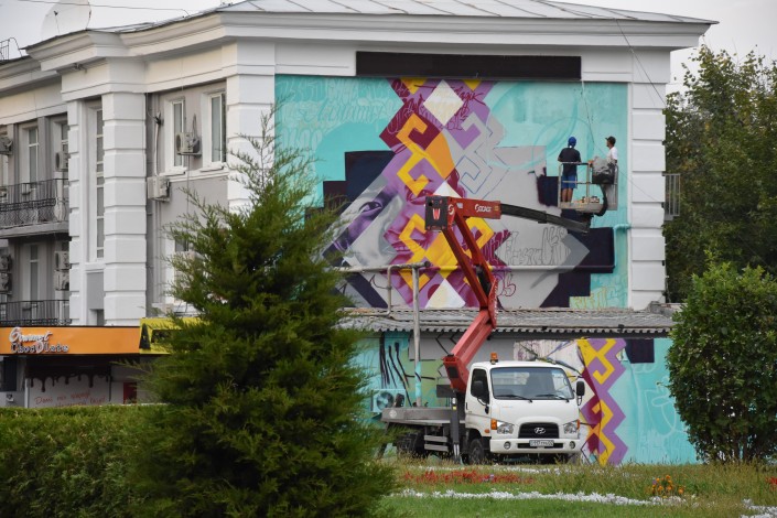 Другие участники команды Repas - Recon - Айдар Джусамбаев и Rusel - Руслан Гилязов изобразили на своем фасаде работы казахстанского художника-графика Расильбека Естемесова, у которого очень интересный и самобытный этно-стиль. Ребята пошли дальше и сделали коллаж из его работ, ведь так сложно выбрать что-либо одно из такого многообразия образов и сюжетов.
