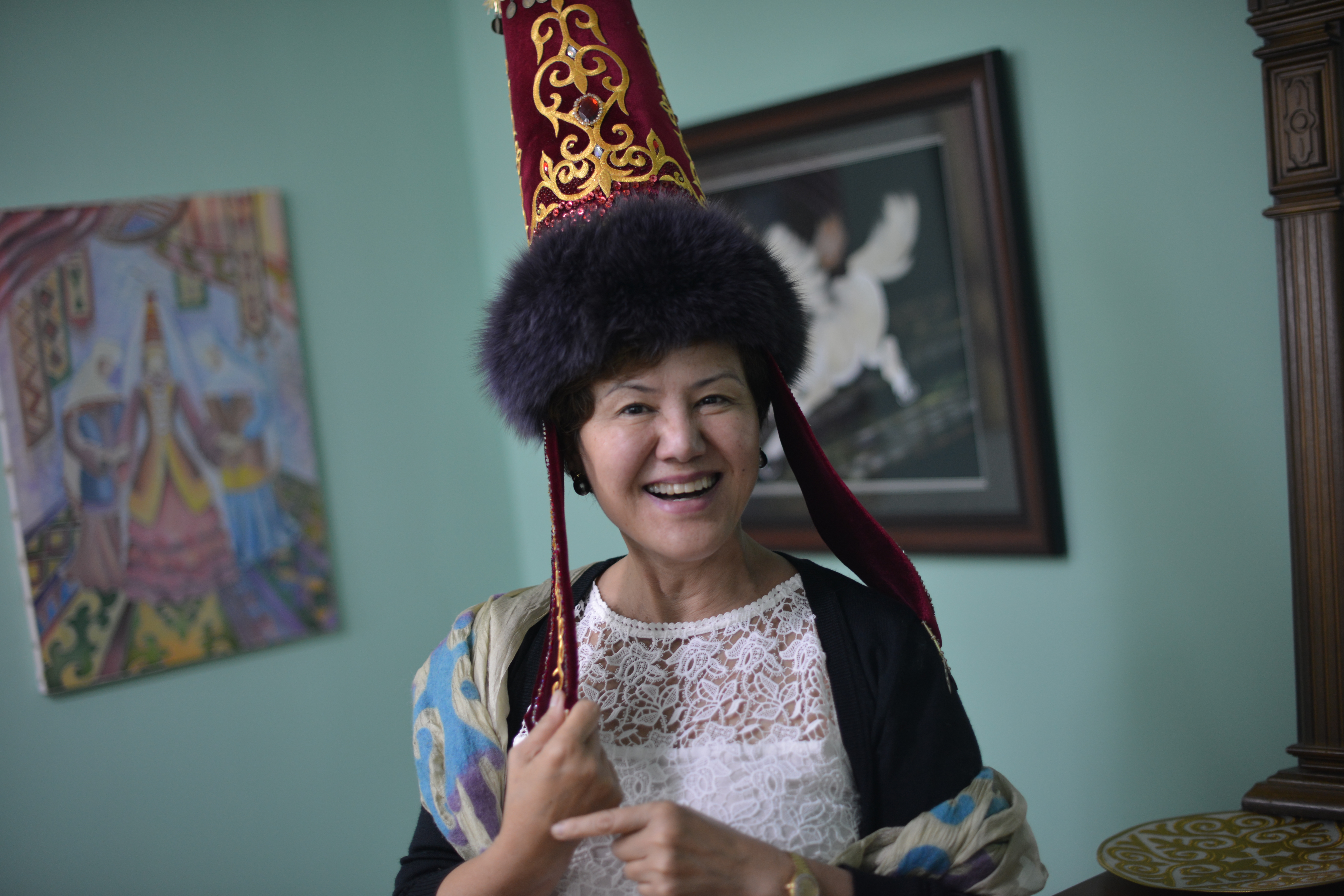 Представительницам дипмиссий провели экскурсию по институту и рассказали о том, чем здесь будут заниматься его воспитанницы. В кабинете прикладного мастерства супруга представителя посольства США Элоиса Клечески примерила национальный головной убор.