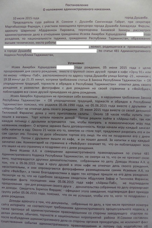 Амирбека Исаева обвинили в нарушении статьи 8 закона "Об упорядочении традиций и обрядов в Республике Таджикистан", которая предписывает отмечать дни рождения только с семьей. Обвинение было предъявлено из-за фотографий, которые Исаев опубликовал на своей странице в Facebook. Там же он поблагодарил друзей, присутствовавших на праздновании.