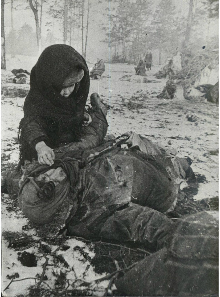 Советский ребенок рядом с убитой матерью. Концлагерь для гражданского населения "Озаричи". Беларусь, местечко Озаричи Домановичского района Полесской области.