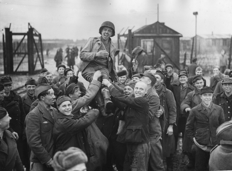 Освобожденные из лагеря в Эзельхайде советские военнопленные качают на руках американского солдата.