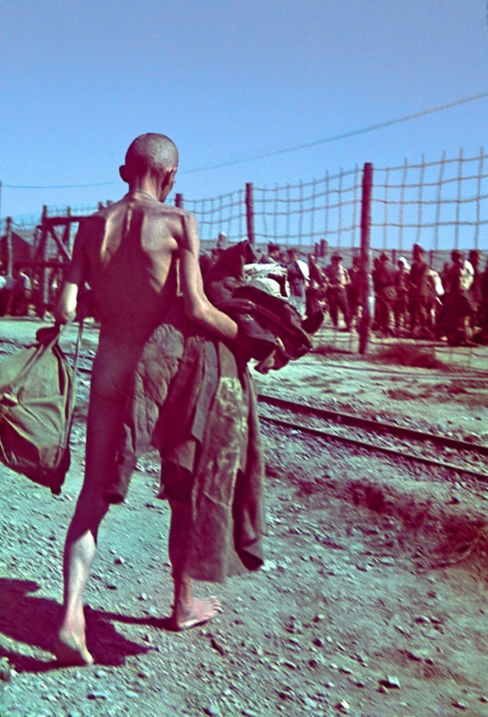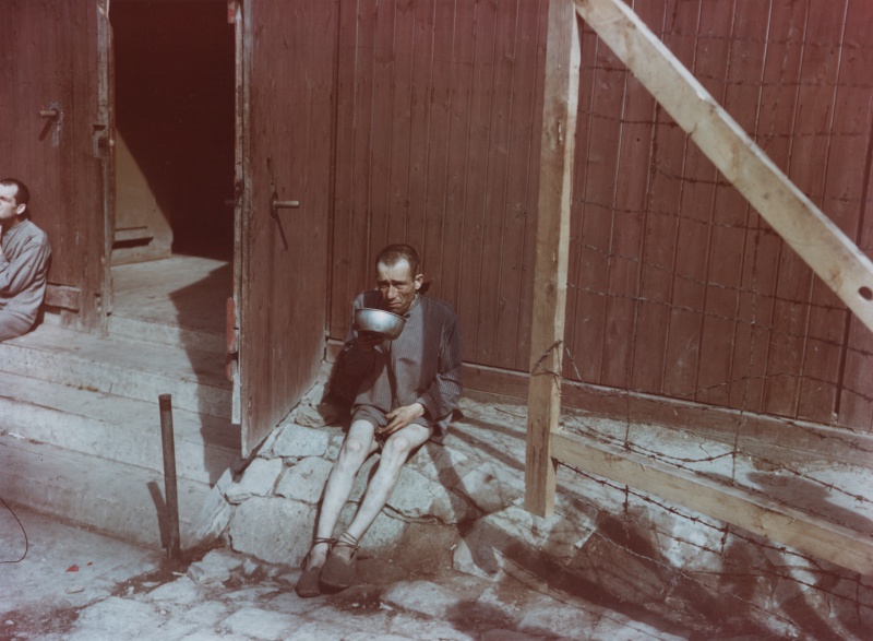 Один из истощенных заключенных лагеря в Эбензее греется на солнце. Концлагерь Эбензее находился в 40 километрах от Зальцбурга (Австрия). Лагерь существовал с ноября 1943 по 6 мая 1945 года. За 18 месяцев через него прошли тысячи узников, многие из которых здесь погибли. Известны имена 7113 погибших в условиях бесчеловечного содержания. Общее же число жертв составляет более 8200 человек.