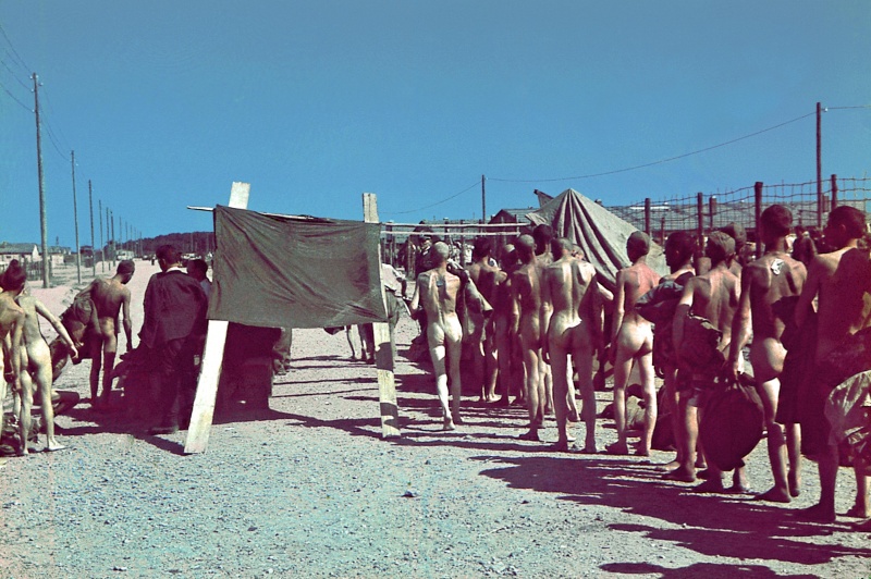Советские военнопленные проходят дезинфекцию в немецком лагере для военнопленных Цайтхайн.