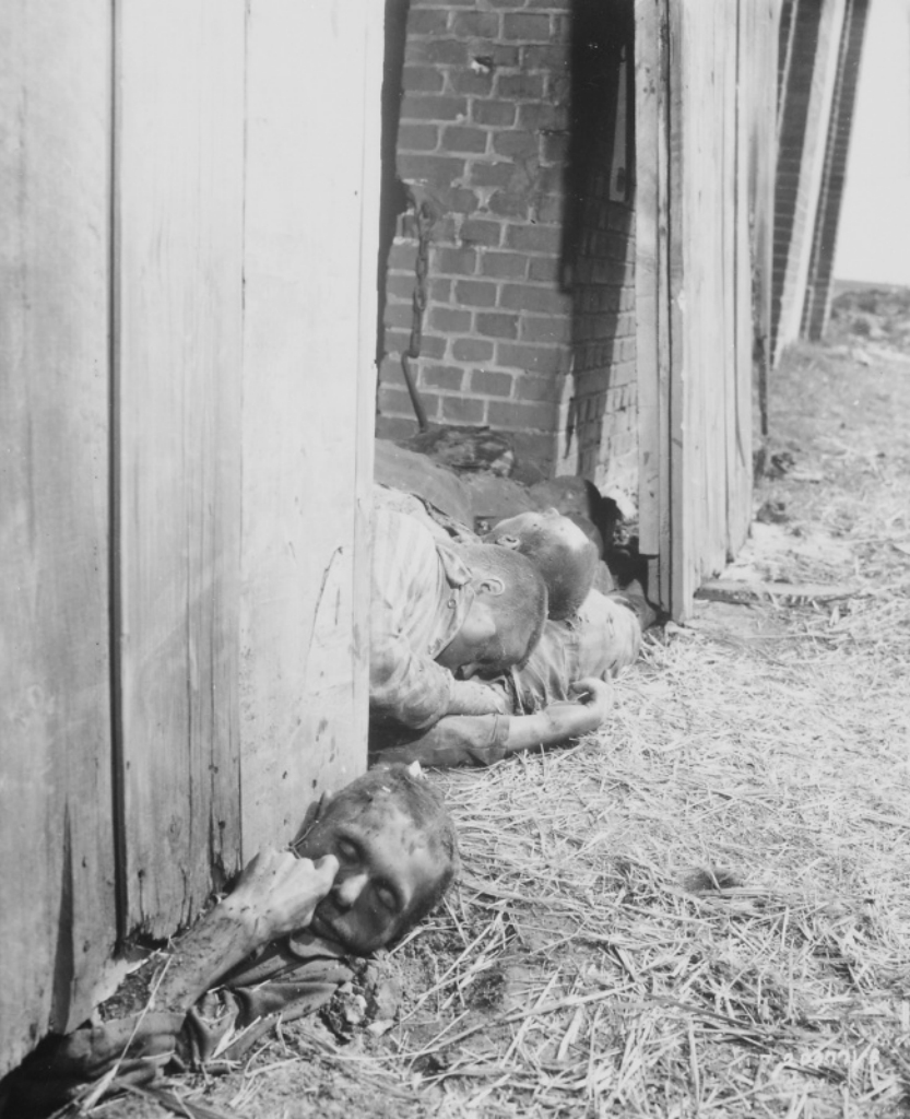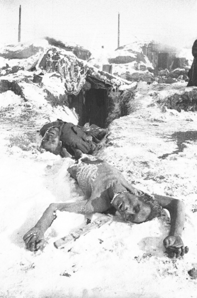 Погибшие от голода и холода пленные красноармейцы. Лагерь для военнопленных находился в селе Большая Россошка под Сталинградом.