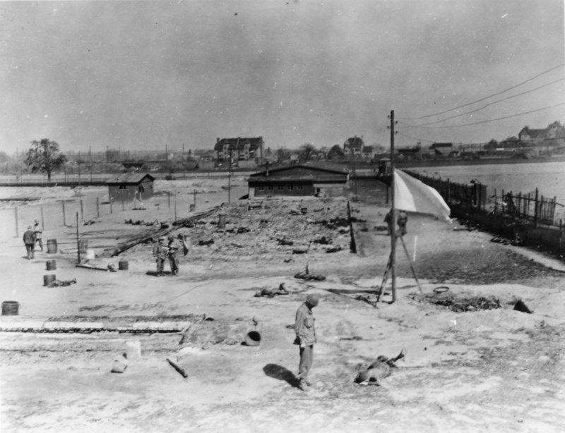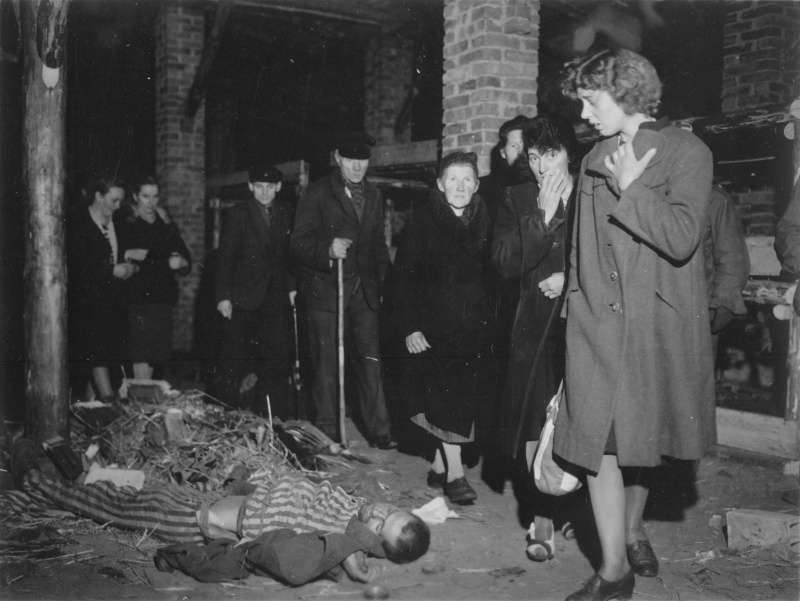 Жители города Людвигслуст проходят мимо тел узников одноименного концлагеря для военнопленных. Тела жертв были найдены военнослужащими американской 82-й воздушно-десантной дивизии. Трупы были обнаружены в ямах во дворе лагеря и внутренних помещениях. По приказу американцев мирное население района было обязано явиться в лагерь для ознакомления с результатами преступлений нацистов.
