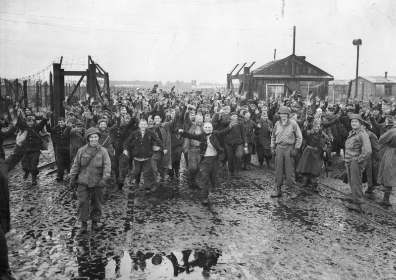 Освобожденные из плена британцы и американцы стоят на территории лагеря военнопленных Дюлаг-Люфт в немецком Вецларе.