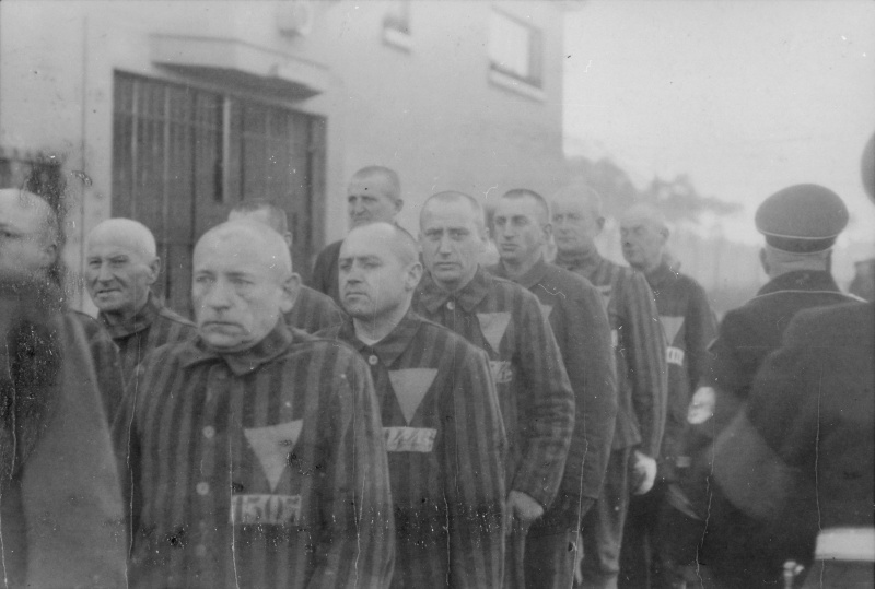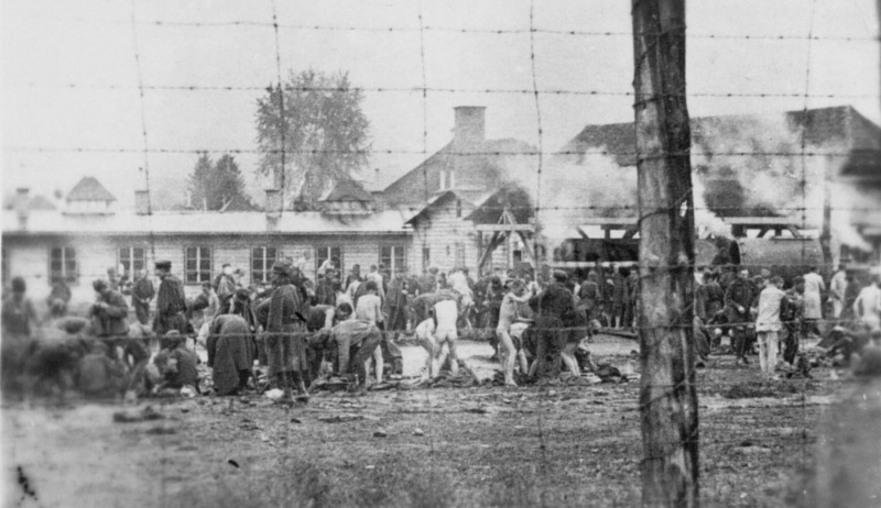 Прибытие заключенных в концлагерь Освенцим. Заключенные централизованно собираются на платформе.