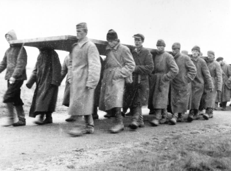 Советские военнопленные при переноске строительных элементов для бараков лагеря "Шталаг 304" Цайтхайн.