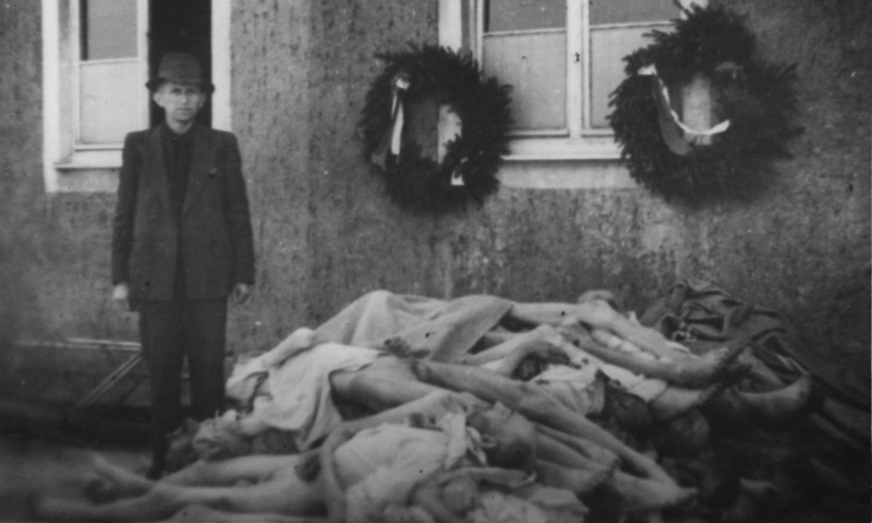 Мужчина в штатском стоит около тел узников концентрационного лагеря Бухенвальд.