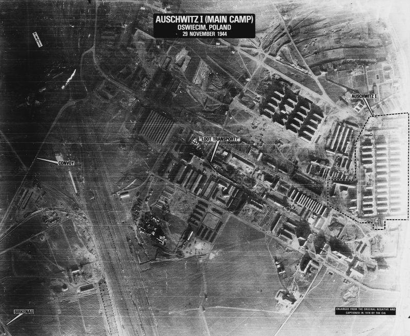 Аэрофотосъемка северо-западной части концлагеря Освенцим с нанесенными основными объектами лагеря: железнодорожная станция и лагерь "Аушвиц I".
