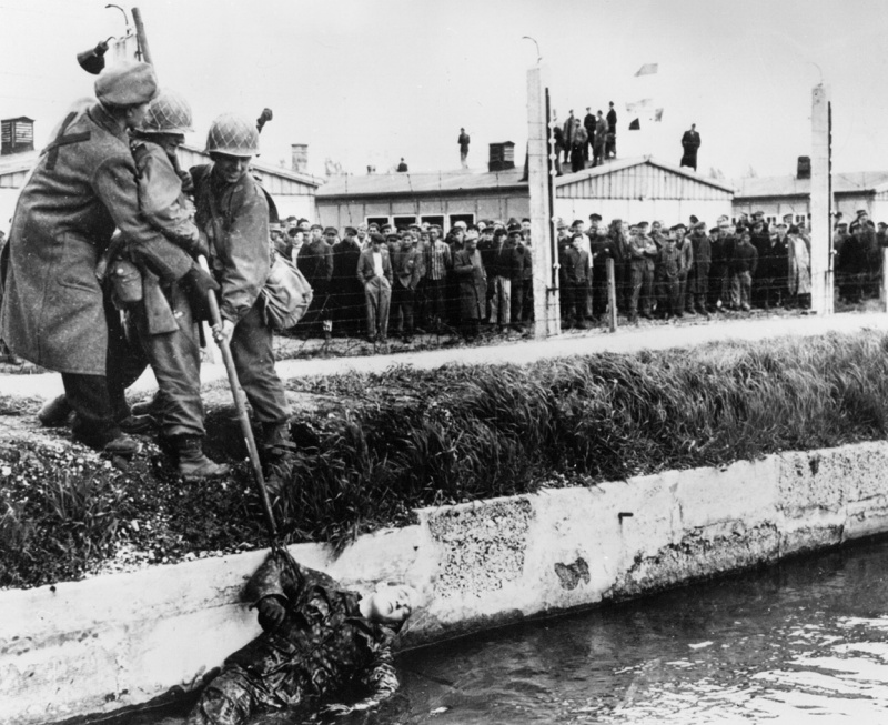 Двое американских солдат и бывший заключенный вылавливают тело расстрелянного охранника СС из канала у концлагеря Дахау.