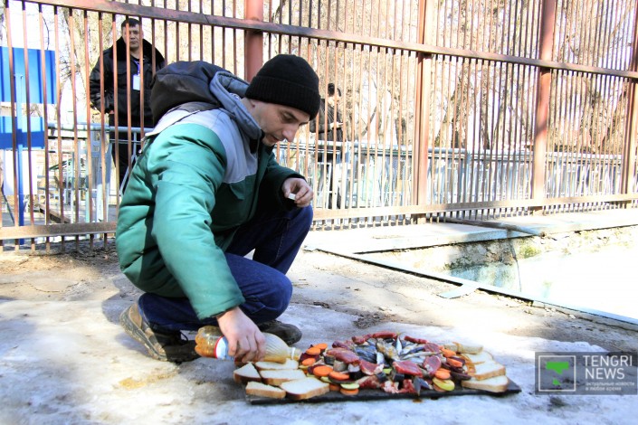 С раннего утра повара готовили лакомство для белого обитателя зоопарка. Когда его выпустили в основной вольер, медведя уже поджидал вкусный обед. Как рассказал заведующий секцией хищных млекопитающих Сергей Эйхвальд, в день медведь потребляет 6,5 килограмма говядины, 5 килограммов рыбы, 2 буханки хлеба и 300 граммов рыбьего жира. Один день в неделю - у них разгрузочный день.
