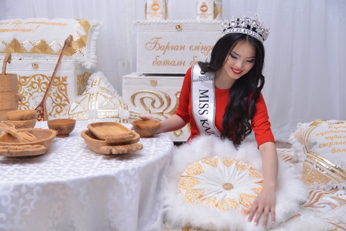 "Мисс Казахстан-2015" Алия Мергембаева из Актау получила в подарок кроме денежного приза традиционное казахское приданое от Дома авторского дизайна "Алтын Орда", сообщает корреспондент Tengrinews.kz.