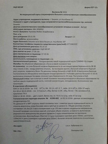 "Дорогой мой Ангел! Меня зовут Жибек. Мне 21 год. Я мама чудесного четырехмесячного малыша Имана. Мы живем в городе Бишкек в Кыргызской Республике. Я пишу это письмо с просьбой о помощи. Рождество и новый год время надежды, мечтаний и чудес. Моя история коротка, время играет не в мою пользу. Все началось в сентябре 2016 года, когда обычный прием у врача будучи на 7 месяце беременности превратился в кошмар. Мне поставили диагноз хондросаркома тазобедренной кости третьей степени.