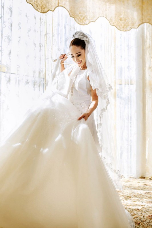 "Әрине, қалыңдық көйлегін алдын ала іздестіріп, қарап жүрдік. Содан дүкендердің бірінде маған бір көйлек ұнап қалды. Ол көйлек жаңа коллекциядан болған екен, осыған дейін ешкім кимеген. Бірақ жалға алсаң сол күні киіп, келесі күні әкеліп беруін тиіс. Оның құны - 100 мың теңге. Кейін тағы бірнеше дүкенді аралап қайттық, бірақ мына көйлек есімнен кетпей қойды. Қатты ұнады, бірақ көйлек ауыр болды. Содан қайта бірінші барған дүкенге бардым. Соңында сол көйлекті алатын болып шештім. Сыйлық ретінде қалыңдық қолына ұстайтын гүл мен жігіт тағатын гүл берілді. Өміріңде бір рет киетін болғандықтан, той көйлегімнің ерекше əрі бəрінің есінде қаларлықтай болғандығын қаладым. Өзім армандаған той көйлегін əперген жолдасыма алғысым шексіз", - дейді Мария.
