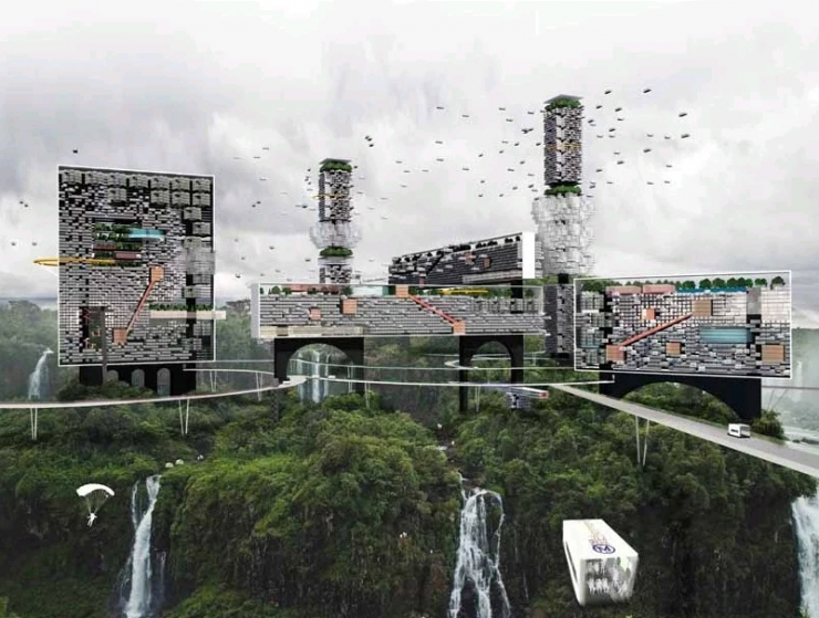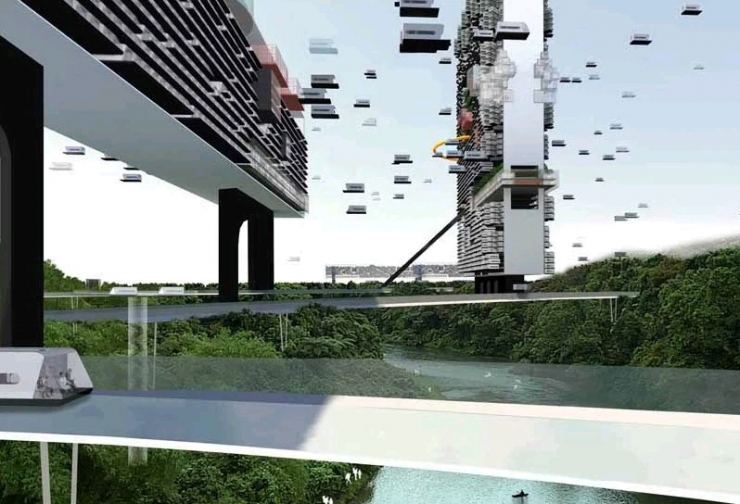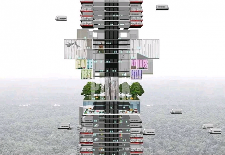 По задумке в городе будет находиться несколько башен, опирающихся на высокие сваи и состоящих из летающих капсул, а все здания соединят между собой сетью мостов. Разработчики планируют поднять их как можно выше, чтобы освободить пространство для роста деревьев и таким образом вернуть природу "в исходное состояние" и восполнить лесные массивы.