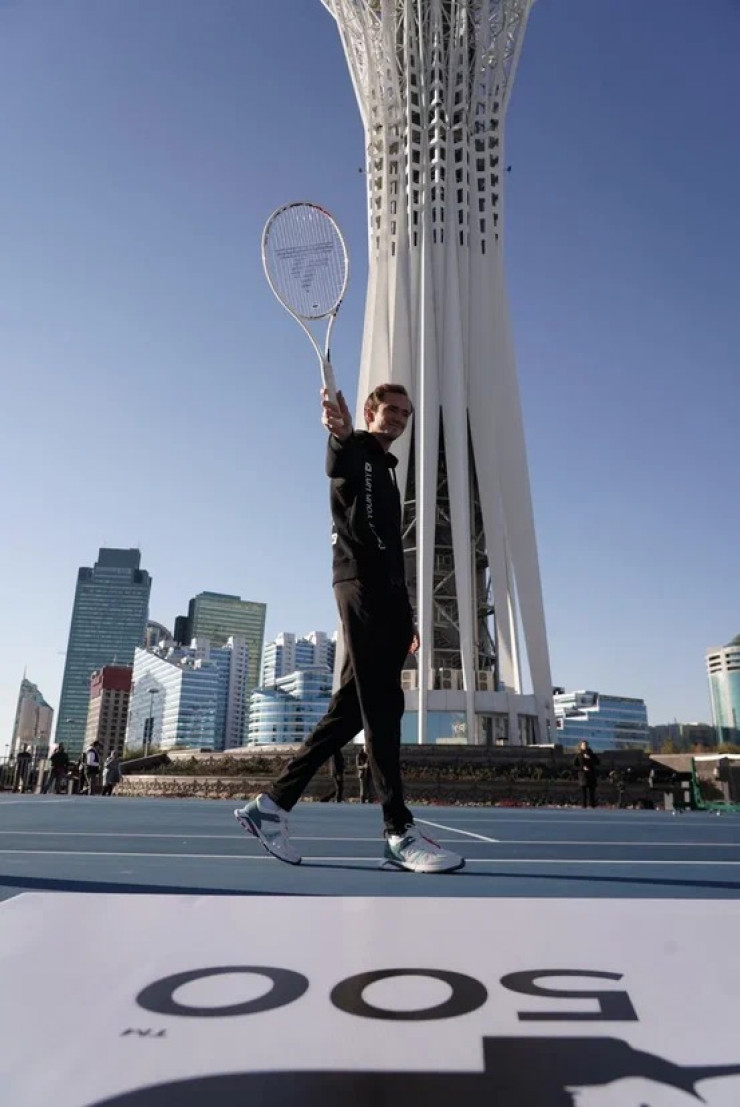Четвертая ракетка мира, россиянин Даниил Медведев и восьмой сеяный турнира ATP 500 Astana Open канадец Феликс Оже-Альяссим провели выставочный матч перед главной достопримечательностью столицы - Байтереком, сообщает пресс-служба ФТК.